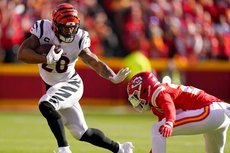 2022 AFC Championship: Chiefs-Bengals Cincinnati Bengals running back Joe Mixon (28) evades a tackle attempt by Kansas City Chiefs safety Juan Thornhill (22) during the first half of the AFC championship NFL football game, Sunday, Jan. 30, 2022, in Kansas City, Mo. (AP Photo/Charlie Riedel) (Charlie Riedel/AP)