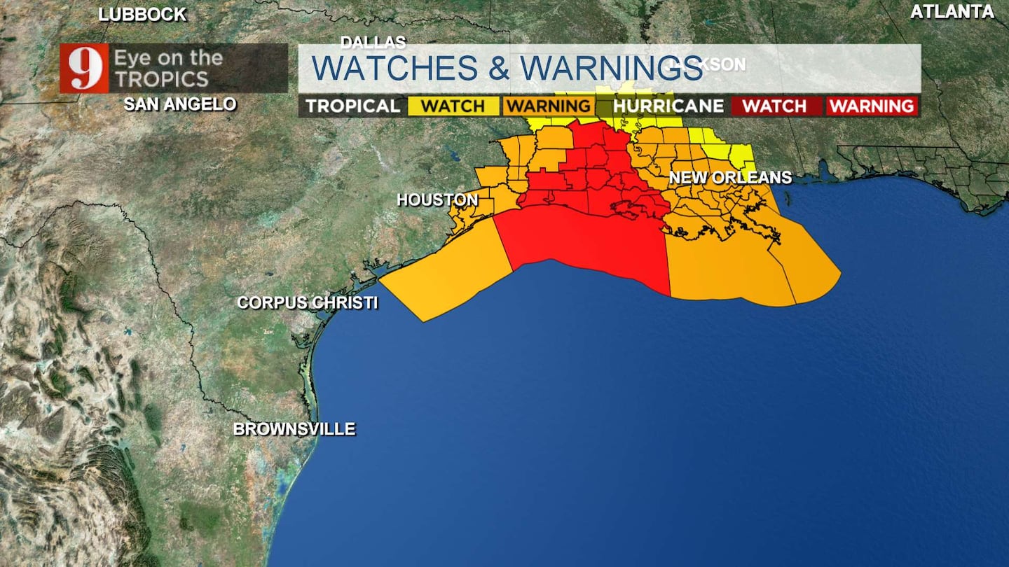 A hurricane warning is in effect from High Island, Texas, to Morgan City, Louisiana.