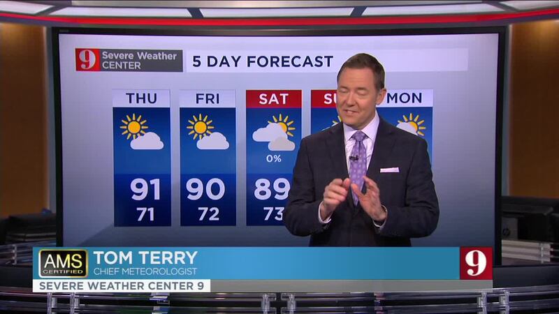 This week's forecast calls for a dry weather pattern with highs near 90 and nearly no chances for rain. Wednesday's forecast calls for slightly warmer temperatures with a high of 92 and mostly sunny skies.
