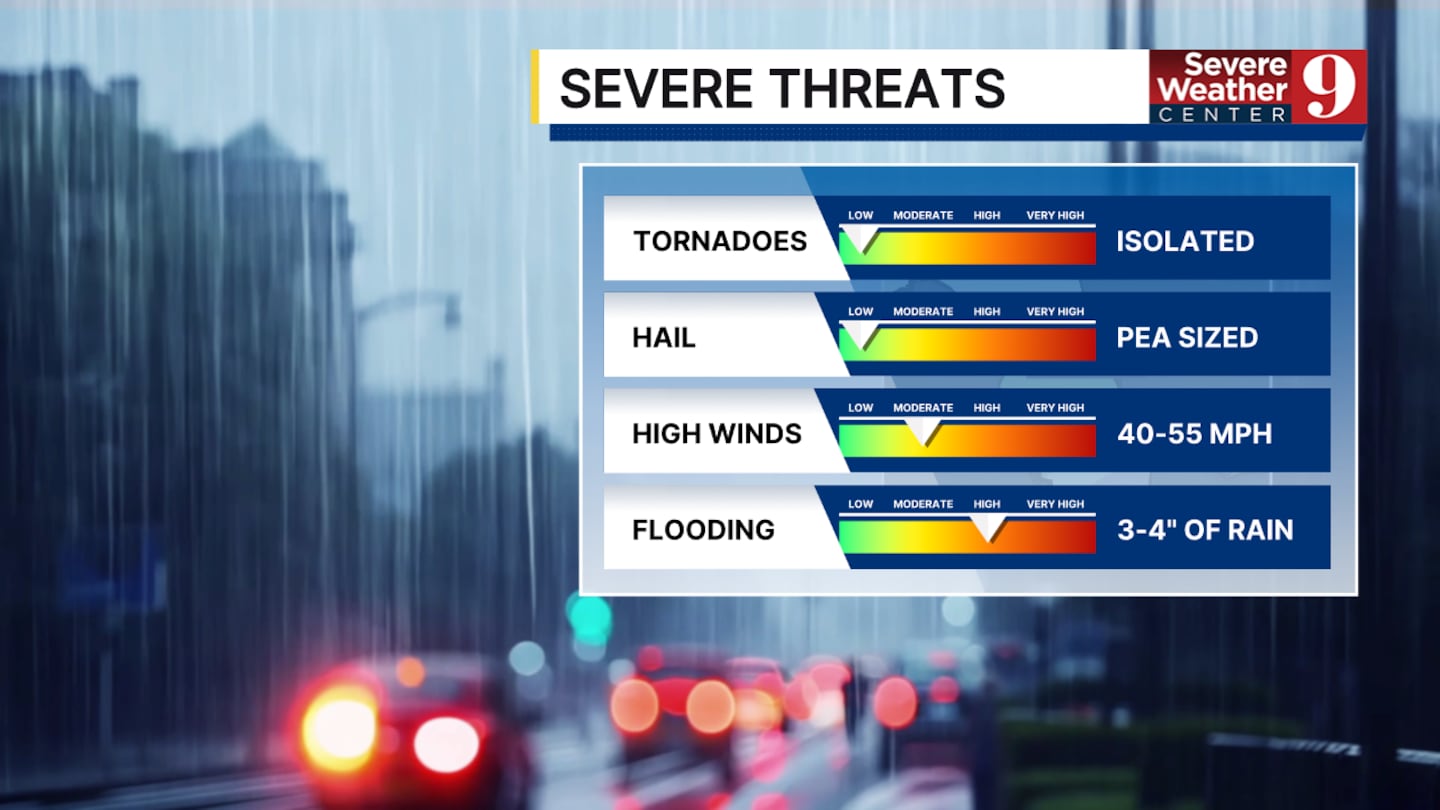 The thunderstorm threat will dissipate by sunset, but widespread showers will continue across the region. Rain is expected to end by lunchtime tomorrow.