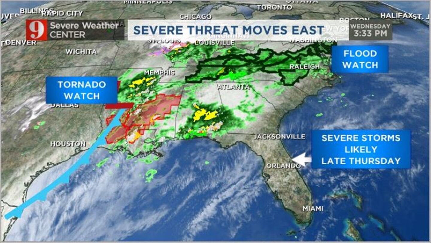ORLANDO, Fla. — Severe storms are possible starting late Thursday but before then, Thursday will stay very warm with near-record high temperatures for Central Florida.