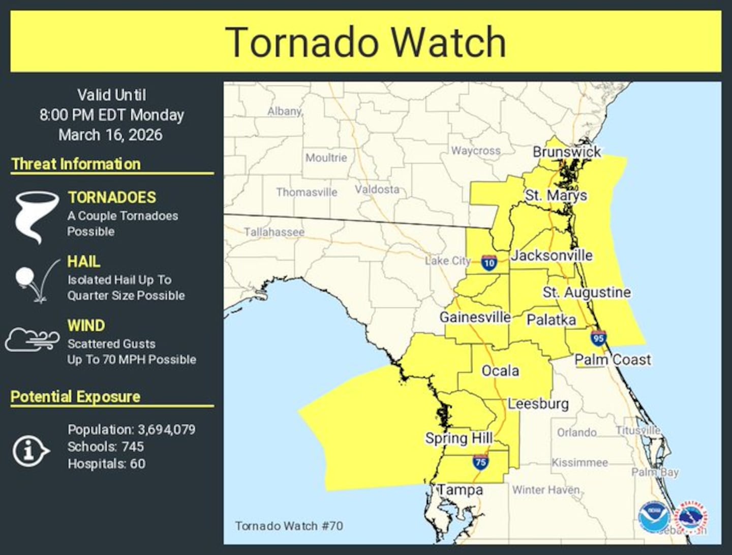 Tornado Watch issued for Sumter, Flagler, and Marion Counties until 8 pm.